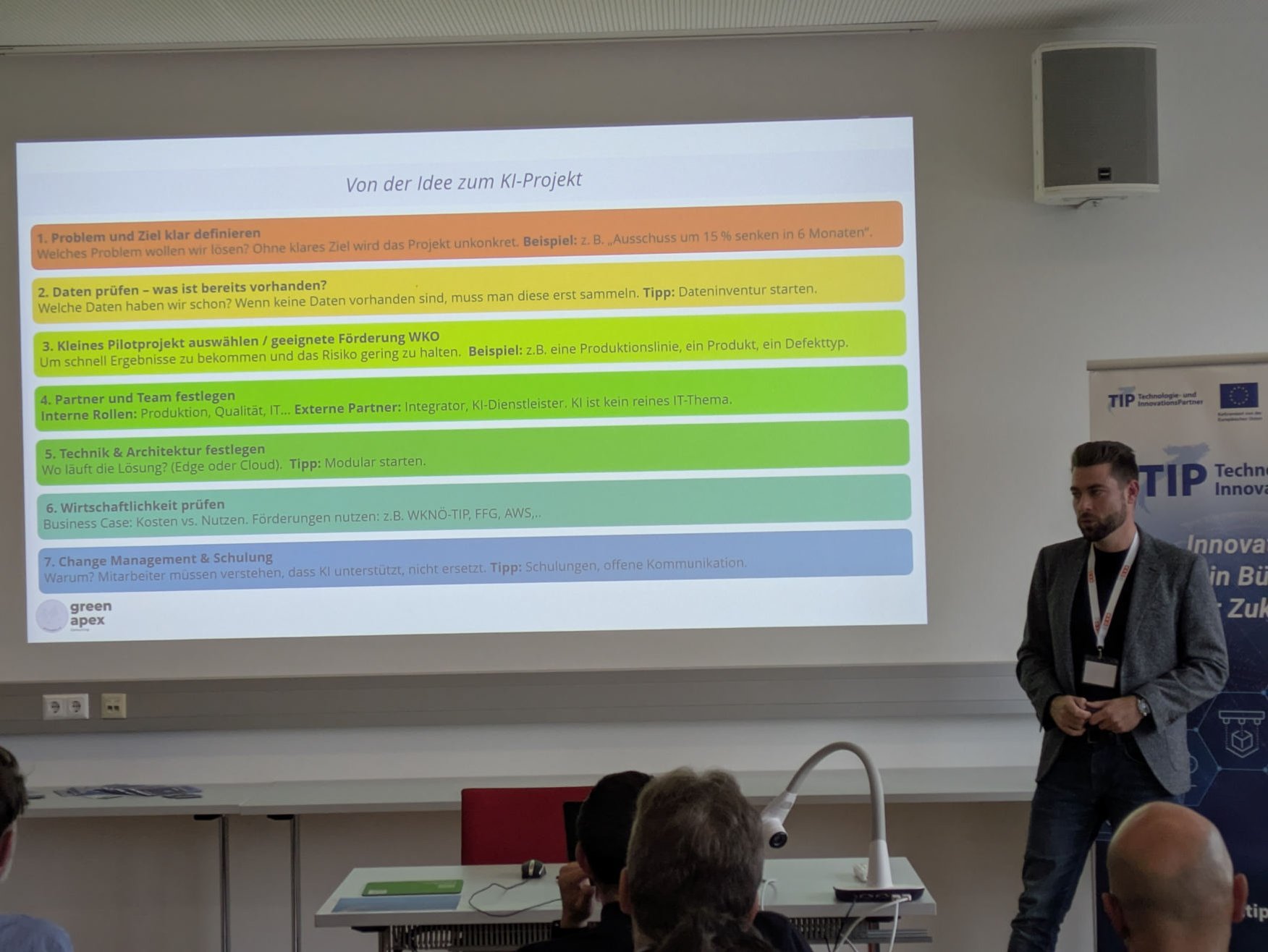 Ein Professor der Universität Wien erläuterte aktuelle Trends in der Datenanalyse und erklärte, wie moderne Inspektionssysteme durch intelligente Algorithmen Qualitätskontrollen automatisieren und optimieren. Im praktischen Teil zeigten die Unternehmen Robimo und GreenApex eindrucksvolle Anwendungsbeispiele aus der industriellen Praxis. Sie demonstrierten, wie KI-basierte Systeme Fehler in Echtzeit erkennen, Wartungszyklen vorausschauend planen und Produktionsdaten effizient aufbereiten können.